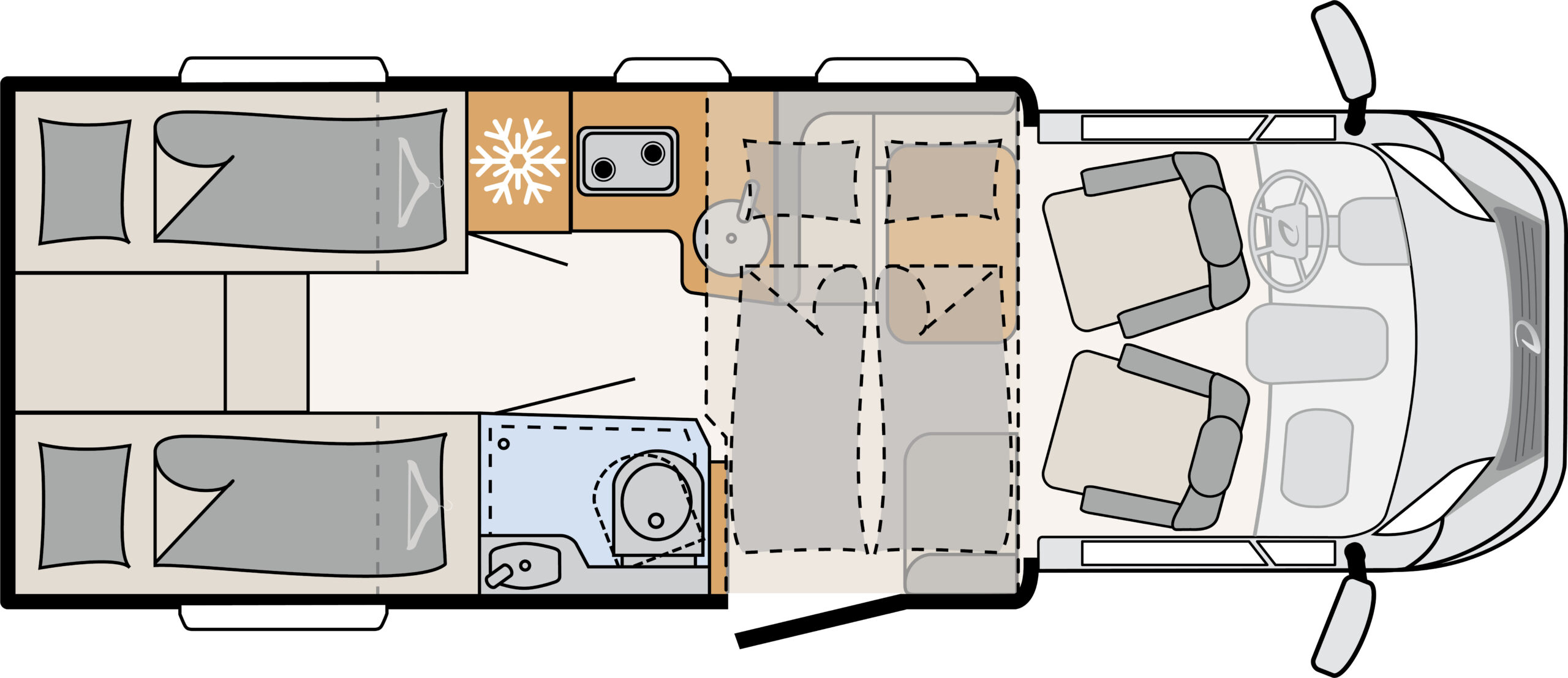 Distribución con camas gemelas traseras sobre garaje, cocina central, baño completo con ducha integrada tipo «Vario» y cama basculante eléctrica sobre el salón.